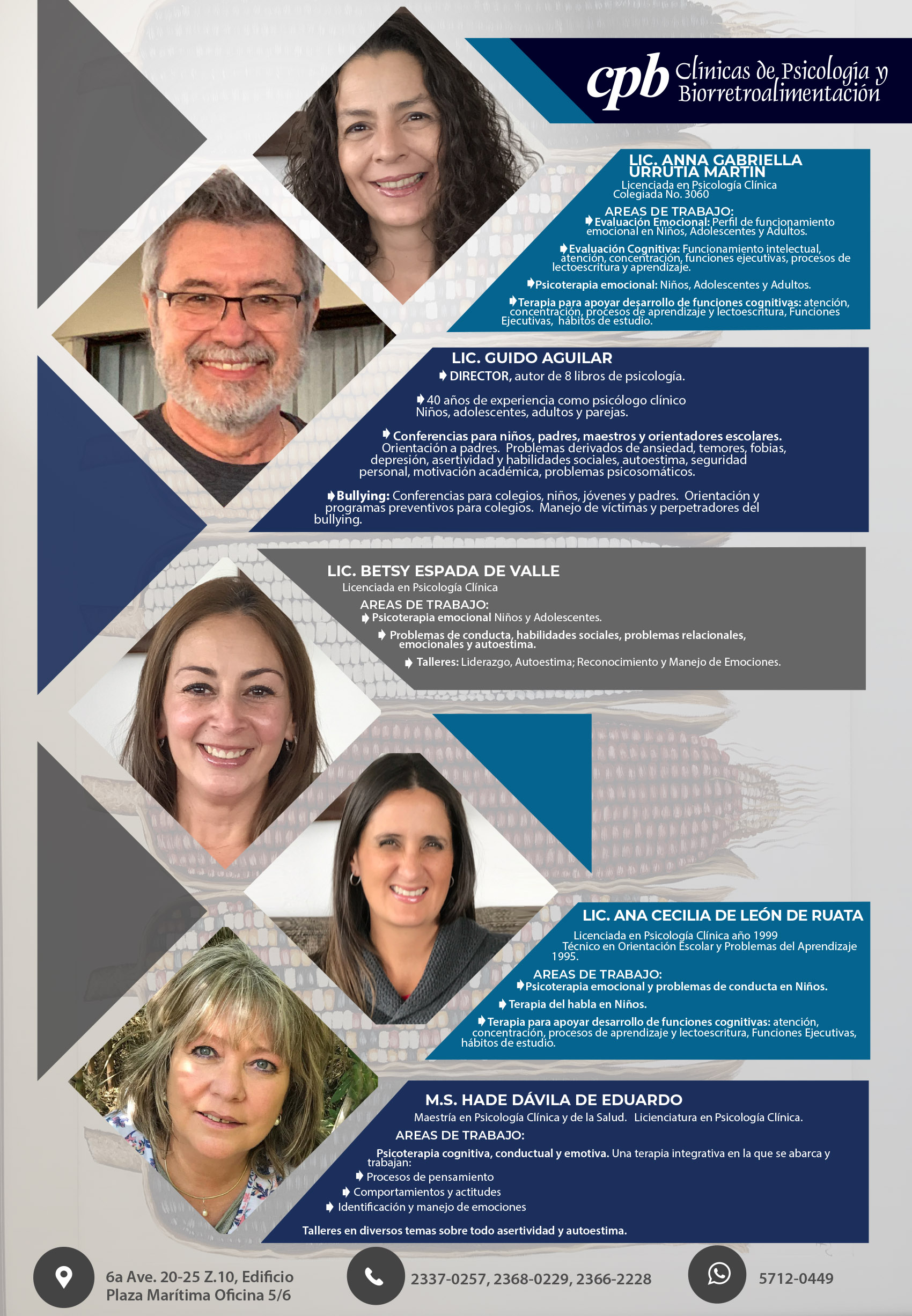 Graduada de la Universidad en Francisco Marroquín (Guatemala) en 1996 se ha especializado en evaluación y tratamiento de problemas emocionales, educativos y escolares. Atiende niños, adolescentes y adultos.